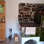 Les équipements de cuisine de cette villa Vidiecky Domcek Na Samote comprennent une bouilloire électrique, un réfrigérateur et une table de cuisson, fournis dans un coin repas.